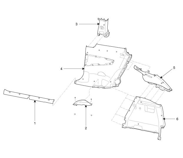 1. Garniture du montant avant 2. Ornementation supérieure du pilier central 3. Ornementation inférieure du montant central 4. Garniture du montant arrière [5 portes] 5. Ornementation de protection de la porte avant |