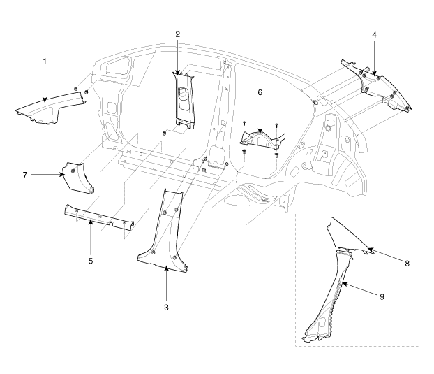 6. Ornementation de protection de la porte arrière 7. Ornementation latéral d'auvent 8. Garniture du montant arrière [4 portes] 9. Garniture du logement de roue arrière [4 portes] |