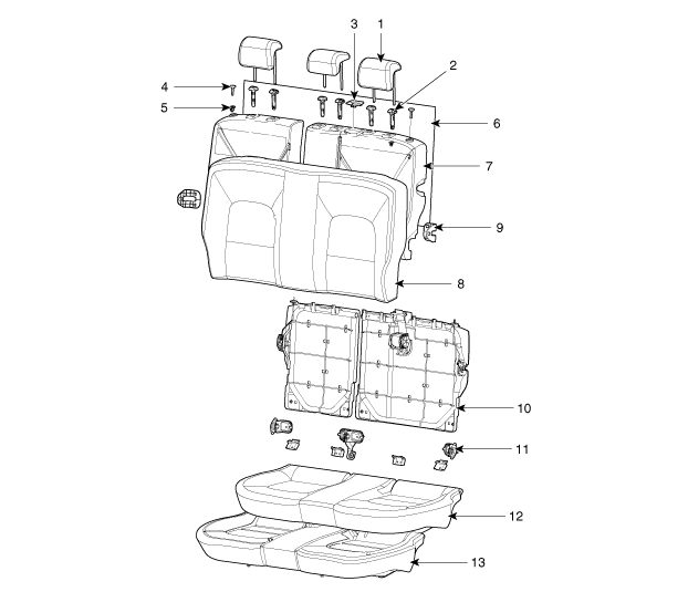 8. Revêtement de dossier de siège arrière 9. Revêtement du verrouillage du dossier de siège arrière 10. Ensemble de l'armature du dossier de siège arrière 11. Ensemble de la charnière du dossier de siège arrière 12. Revêtement du coussin de siège arrière 13. Rembourrage du coussin de siège arrière |