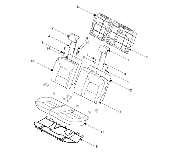 10. Douille du bouton de dossier arrière [D] 11. Revêtement de dossier de siège arrière [G] 12. Chiffon de silencieux de dossier de siège arrière [G] 13. Revêtement de dossier de siège arrière [D] 14. Chiffon de silencieux de dossier de siège arrière [D] 15. Ensemble de l'armature du dossier de siège arrière [G] 16. Ensemble de l'armature du dossier de siège arrière [D] 17. Revêtement du coussin de siège arrière 18. Cadre de l'assise de siège arrière |