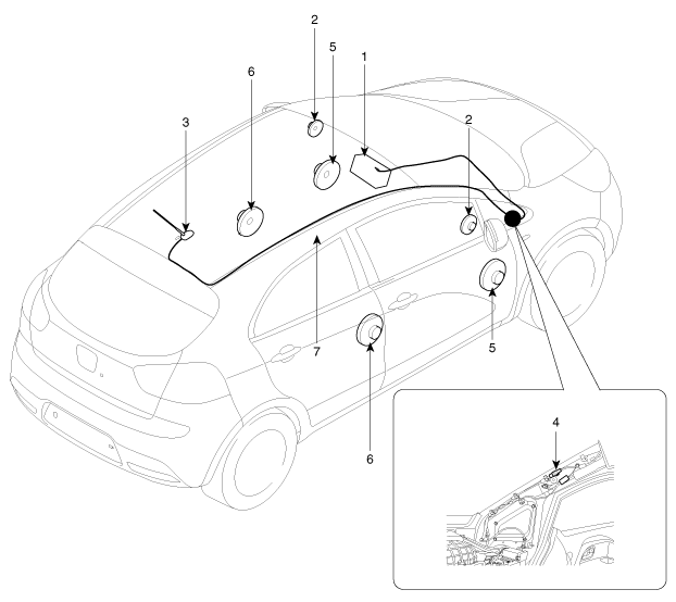 5. Haut-parleur de la porte avant 6. Haut-parleur de la porte arrière 7. Câble d'alimentation de l'antenne |