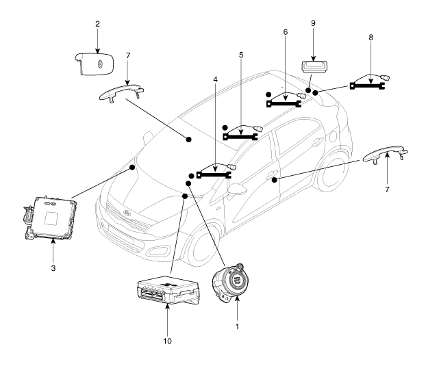 6. Antenne du coffre 7. Poignée de porte et antenne de porte 8. Antenne du pare-chocs 9. Interrupteur ouverture couvercle du coffre 10. Module de commande de carrosserie (BCM) |