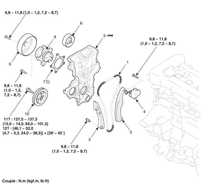 1. Chaîne de distribution 2. Guide de la chaîne de distribution 3. Bras de la chaîne de distribution 4. Auto-tendeur de la chaîne de distribution 5. Couvercle de la chaîne de distribution |