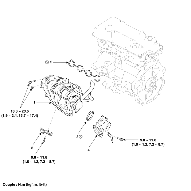 1. Collecteur d'admission 2. Joint du collecteur d’admission 3. Joint du corps du papillon électronique |