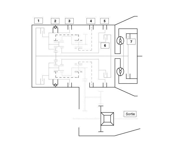 1. Embrayage de surmultiplication (OD/C) 2. Embrayage unidirectionnel (OWC) 3. Frein de marche lente et de marche arrière (LR/B) 4. Frein de vitesse lente (UD/B) |