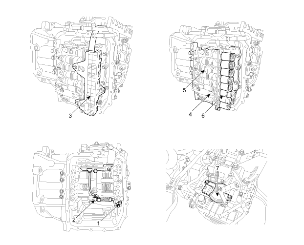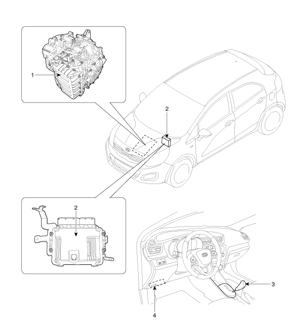 1. Capteur de vitesse d’entrée 2. Capteur de vitesse de sortie 3. Connecteur de l'électrovanne 4. Capteur de température d’huile |