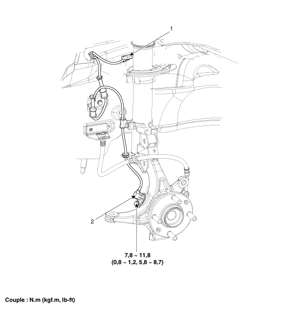 1. Connecteur du capteur de vitesse de roue avant 2. Capteur de vitesse de roue avant |
