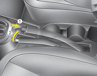 Pour désengager le frein de stationnement, appuyez d'abord sur la pédale de frein puis soulevez légèrement le levier du frein de stationnement. Ensuite, enfoncez le bouton (1) de dégagement du levier et rabaissez le levier du frein de stationnement (2), tenant le bouton enfoncé.