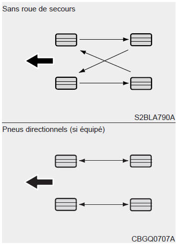 Les pneus radiaux à motif de bande de roulement asymétrique ne devraient être permutés que de l'avant à l'arrière et non pas de gauche à droite.