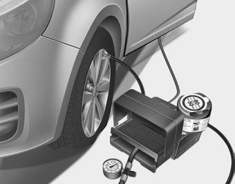 8. Le bouton Engine Start/Stop ou le commutateur d'allumage réglé sur ON, mettez le compresseur en marche et laissez-le fonctionner pendant 5 à 7 minutes environ afin de remplir le scellant à la pression appropriée (consultez Pneus et jantes au chapitre 8). La pression de gonflage du pneu après le remplissage est sans importance et sera vérifiée/corrigée plus tard. Assurez-vous de ne pas surgonfler le pneu et tenez-vous à bonne distance du pneu pendant le remplissage.